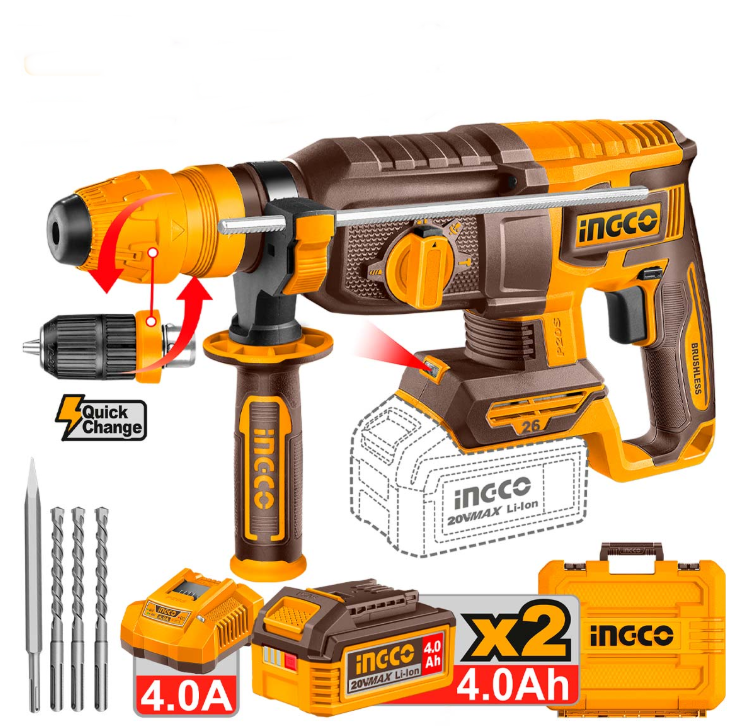 Πιστολέτο Περιστροφικό Κρουστικό Σκαπτικό Μπαταρίας 20V Li-Ion 2.5J Φ26mm +Ταχυτσόκ Ingco